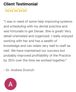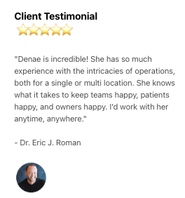 Denae is a seasoned dental consultant with a passion for helping dental professionals achieve their business goals and optimize practice performance. With 20 years of experience in the dental industry, Denae brings a unique blend of expertise in business management, strategic planning, and operational efficiency to her consulting practice.